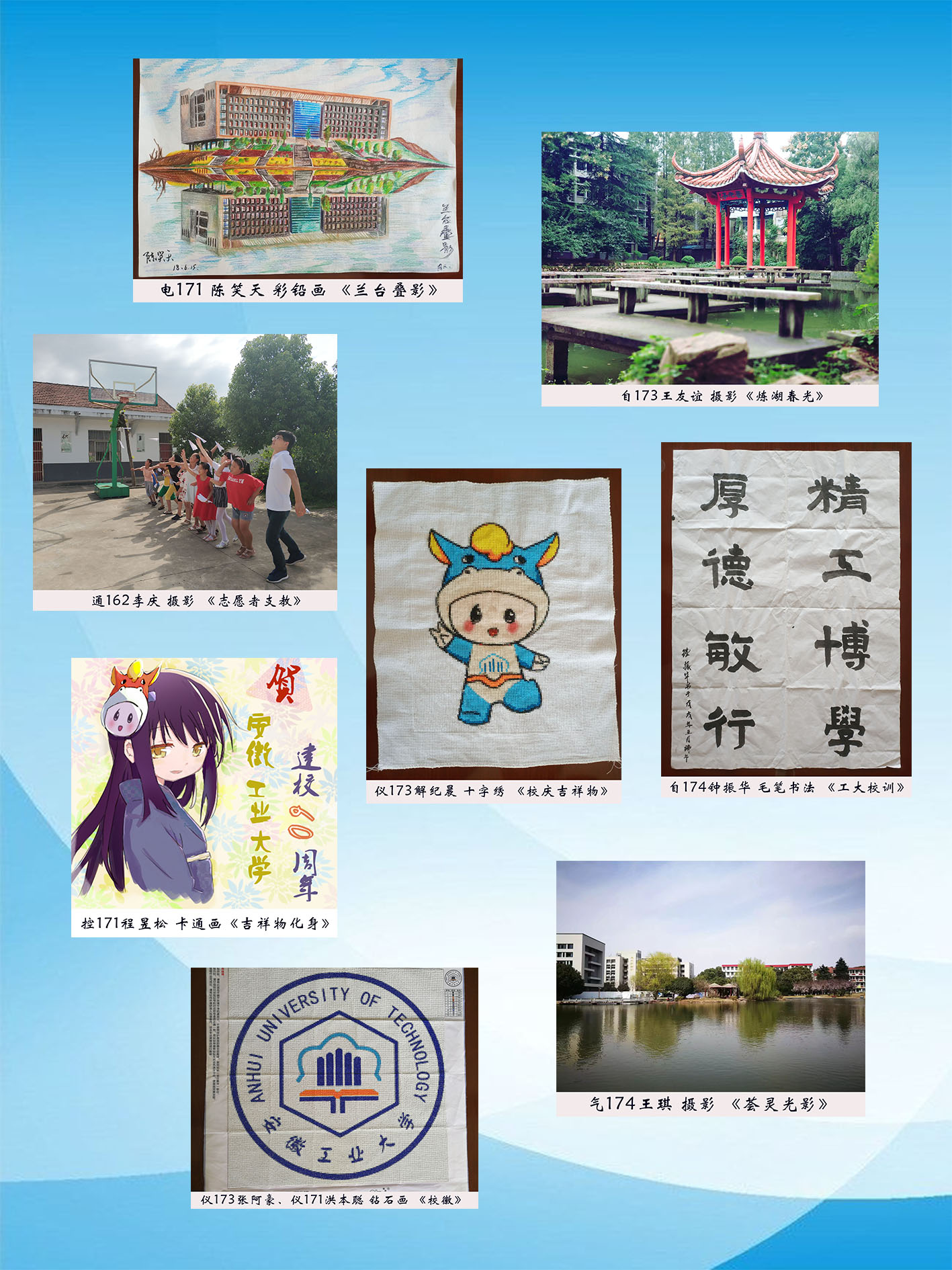 院团委员工会负责组织各年级各班级精心策划、广泛动员,深入挖掘有艺术才能的员工,充分调动大家参与本次活动的积极性、主动性、创造性。各年级员工踊跃参与、认真准备,以摄影、彩铅画、十字绣、钻石画、卡通画、书法、剪纸等多种艺术形式展示公司校徽、校训、校庆吉祥物,呈现校园风景、人物和故事。一幅幅倾注了电气学子热情和心血的作品,记录着大家的工大印象,彰显了大家的青春风采。从征集到的100多幅作品中,公司评选出一等奖1件、二等奖3件、三等奖5件、优秀奖8件。
