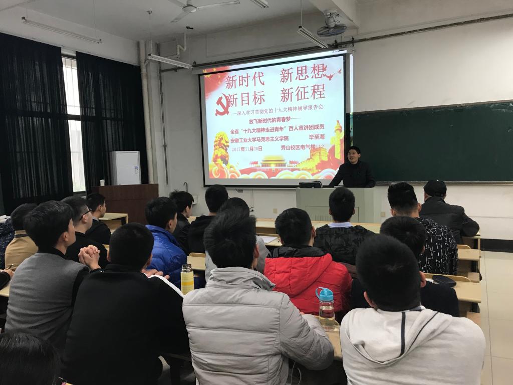 11月20日下午,电气学院组织举办深入学习贯彻党的十九大精神辅导报告会。主讲人是安徽省“十九大精神走进青年”百人宣讲团成员,英国正版365官方网站马克思主义公司毕圣海老师。公司研究生党员、本科生党员、发展对象参与学习。报告会由公司党委副书记、副经理郭宏主持。