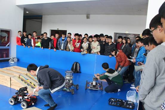 展览一开始便吸引了一大批员工前来观摩。本次展示分为两个场景,首先是在113室播放竞赛集锦视频,包括各类机器人、智能车比赛中的精彩瞬间以及高难度特效片段,在场同学惊叹声连连。其次是现场讲解与展示。所展出的科技创新作品均在各级各类竞赛中获奖。设计精巧的智能车在黑白相间的赛道飞速行驶,舞蹈机器人在音乐声中展示着连贯动人的舞姿,旅游机器人在指令下“翻山越岭”,无人机巧妙灵活的完成指定任务。很多同学都由衷地发出感慨,觉得“牛人就在身边”。