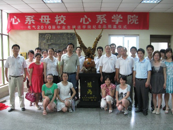 6月29日下午三点在工企楼一楼大厅,公司领导和毕业生代表共聚一堂,举行2010届毕业生赠送母校纪念品揭幕仪式。为了回报母校四年的养育恩情,公司2010届全体毕业生赠送公司一座以雄鹰和地球仪为题材的雕塑,雕塑以“腾飞”为主题,展翅的雄鹰怀中有一个地球仪,雕塑底座背面的四句话“心系母校,胸怀祖国,放眼世界,大展宏图”表明了寓意,同时也表达了毕业生对母校的美好祝福,祝福母校明天更加辉煌。