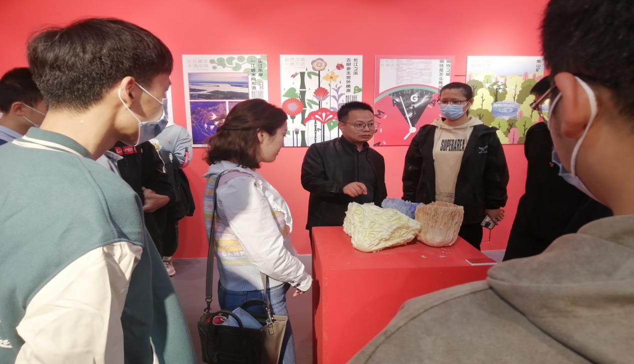 进入展馆,一件精美的陶瓷作品《白菜心》映入眼帘,汪正向员工们介绍这件作品的创作灵感来源于习近平总书记来到马鞍山市考察调研时指示要把马鞍山打造成长三角“白菜心”的重要指示精神,艺设公司的师生们将习近平总书记的指示要求与他们所学的专业相结合,烧制出三颗象征“白菜心”的陶瓷作品,该作品制作工艺精湛,白菜叶子薄如蝉翼,惟妙惟肖,同学们纷纷对这件作品的巧妙构思与精美制作表示赞叹。观展过程中汪正向同学们简述马鞍山的发展历程,他告诉员工马鞍山因钢而兴,因钢立市,过去的无序发展导致许多生态问题,如今,一条生态环境高水平保护与经济社会高质量发展统筹推进的新路正被奋力闯出,马鞍山市开展以薛家洼为重点区域的长江东岸综合整治,从昔日“脏乱差”到如今“美如画”,站在位于长江东岸的薛家洼远眺,水光潋滟、水鸟翩翩,江豚戏水的场景时隐时现,马鞍山这颗“白菜心”正用实际行动贯彻落实绿水青山就是金山银山的生态发展理念,这些理念也被师生们设计在馆内许多作品中。