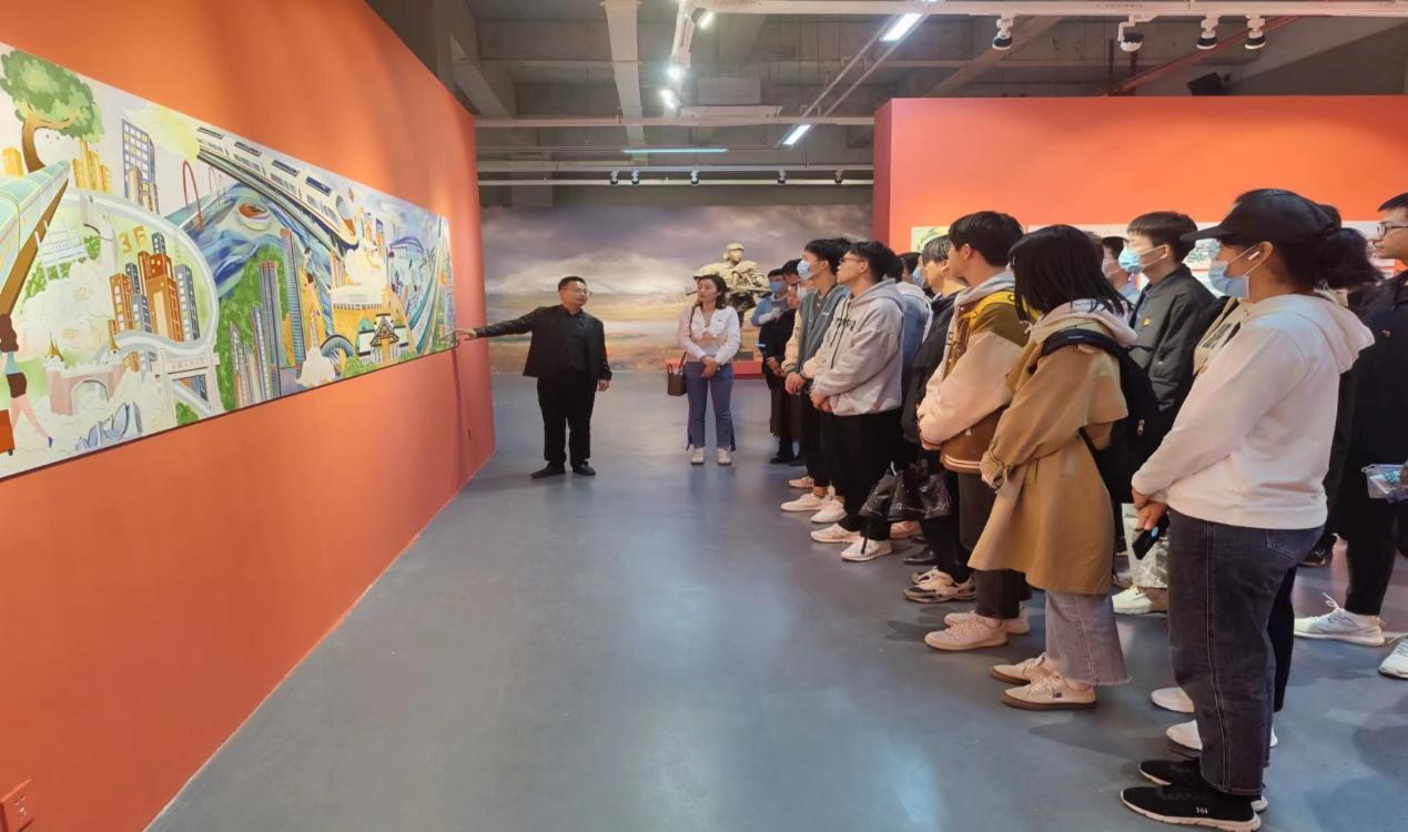 汪正为同学们讲解每一件作品的来源,其中一幅缤纷多彩的长画卷吸引了同学们的注意。汪正介绍这幅图的创作思路来源于马鞍山加入长三角一体化的发展战略,向我们展示了马鞍山的蓬勃发展劲头,通过画卷,支部党员了解到当下长三角首个铁水联运工程——郑蒲港铁路、巢马城际、宁马城际、宁马高速“四改八”、宁和高速等大通道全线开工,毗邻城市的产业正在一体互融,实现地区突破,也使马鞍山与长三角城市的距离前所未有的拉近。除此之外,员工党员还观看了关于助力马鞍山乡村振兴的相关文化产品、社会主义核心价值观宣传作品、以及以党史故事为题材而设计的雕塑作品。这里的每一件文化作品、每一个创意设计都在用以笔传情,以画传志的方式,介绍着马鞍山的历史与人文,抒发着对党和祖国的热爱,表达出公司师生对迎接党的二十大胜利召开的喜悦之情。
