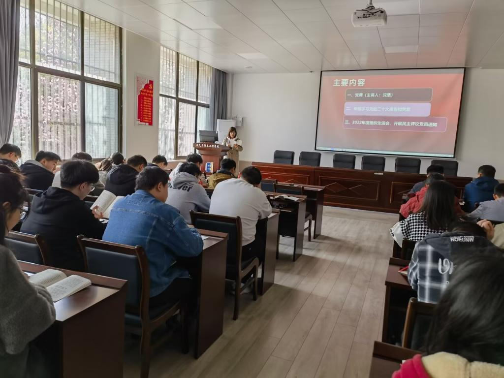 李冉带领大家重温了党的二十大报告原文中第五部分,以报告中“实施科教兴国战略 强化现代化人才建设支撑”为切入点,阐述党和国家在教育、科技和人才方面的重大战略部署,指出青年员工应有的时代担当;她从百年党章的历史回顾、党章修订的重要意义、主要内容、基本原则、学党章感悟等五个方面,阐述了党的二十大所提出的新思想新论断,作出的新部署新要求。随后,集体观看了党的二十大报告专家解读视频,让同学们对党的二十大精神内涵和历史方位有了更全面的领悟和认识,她号召广大研究生党员和入党积极分子要主动担当作为,勇攀科研高峰,为建设国内知名特色高水平大学贡献出自己的一份力量。