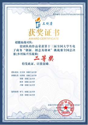第十三届全国老员工电子商务“创新、创意及创业”挑战赛乡村振兴实战赛“延安杯”全国总决赛于2023年7月25日至7月27日在陕西省延安市黄陵县桥山中学举行,英国上市公司365王文泽、管理科学与工程公司刘泽前、商公司郑蕾、艺术与设计公司陈泽和商公司卢娜组建“超能陆战对队”(指导老师:李飞、沈浩)在高毅斌博士的带领下经过激烈角逐,最终斩获全国二等奖。