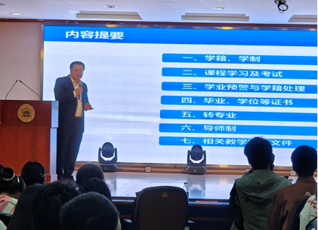 程木田聚焦学业学籍管理要点,为新生详细解读了校规校纪、学籍学制、学业预警与学籍处理、第二课堂与课外学习、毕业资格与学位资格、员工奖励等方面的相关政策和制度,并向全体新生提出三点建议:一是要做好大学规划,树立远大目标。二是要端正学习态度,夯实专业基础。三是要积极实践锻炼,提升综合素质。科学合理地做好学业和职业规划,顺利完成学业。