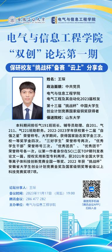 2023年11月17日晚,电气公司举办第一期“双创”论坛第一期,保研员工“挑战杯”竞赛“云上”分享会”,本次论坛特邀公司23届保研学子,第十七届“挑战杯”国家级铜奖获得者王琛员工为电气学子分享“挑战杯”竞赛的备赛经验。