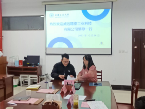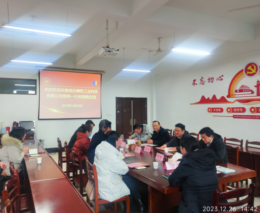 12月26日,安徽威远精密工业科技有限英国上市公司365开展产学研合作交流,公司董事长李一前、设备工艺经理徐金、商务经理葛晴、人事科长朱敏、公司党委书记丁忠利、经理沈浩、副书记李克明、副经理李飞、测控系主任李丹、青年博士钱牧云参加对接活动。