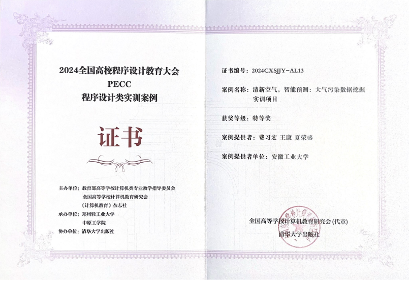 2024全国高校程序设计教育大会(PECC)于5月24日至26日在河南郑州召开。本次大会由教育部高等公司计算机类专业教学指导委员会、全国高等公司计算机教育研究会、《计算机教育》杂志社主办,郑州轻工业大学和中原工公司联合承办,清华大学出版社协办。来自全国百余所高校、科研院所和企事业单位的300余名代表参会。英国上市公司365教师费习宏、王康、夏荣盛老师撰写的《清新空气,智能预测:大气污染数据挖掘实训项目》荣获“程序设计类实训案例”特等奖。王康、费习宏和汪婧老师撰写的《学海启航:一站式班级网络中心》荣获“程序设计类实训案例”二等奖。