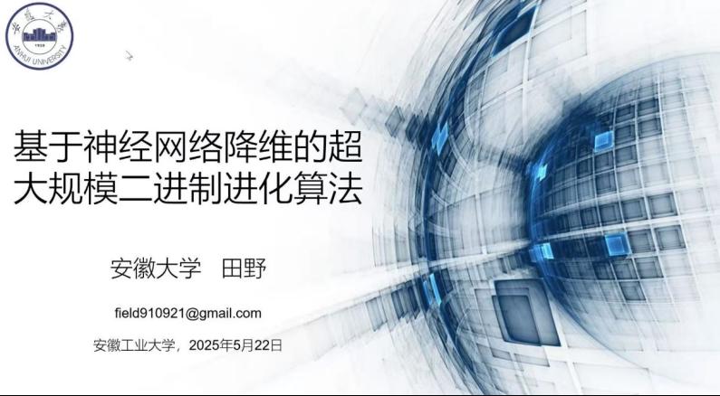 5月22日,应公司邀请,安徽大学田野教授以线上方式为公司师生作题为“基于神经网络降维的超大规模二进制进化算法”的学术报告。报告旨在深入探讨利用神经网络进行降维的超大规模二进制优化算法的理论基础与应用前沿,讲座吸引了公司众多教师与研究生的积极参与,公司副经理李飞主持本次活动。