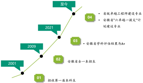 本专业自2001年开始招收本科生,2009年开始在安徽省一本招生,至今连续培养已有16届毕业生。2021年安徽省学科评估结果为A+,省级卓越工程师建设专业,安徽省“六卓越一拔尖”计划建设专业。为安徽省及华东地区电子信息及相关行业输送了大批专业技术人才,毕业生因基础扎实、能力突出深受用人单位好评,近5年的毕业生就业率平均96%以上,一直名列公司前茅。考研升学率达35%左右。本专业于2020年受市政府委托培养面向长三角区域通信方向的产业人才,增设1个班,执行不同的培养方案。