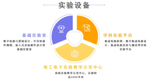 本专业拥有电路、电子线路、数字电路与逻辑设计、信号与系统、数字信号处理、半导体器件物理、微机原理与单片机技术、嵌入式系统硬件设计、微处理器组成与系统结构等基础实验室,集成电路原理、模拟集成电路设计、数字集成电路设计、半导体制造工艺、集成电路封装与测试等学科实验平台,其中电工电子实验教学示范中心是省级实验教学示范中心,总面积近2000平米。