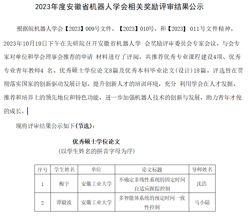 近日,安徽省机器人学会宣布了2023年度优秀硕士学位论文的评选结果,公司两篇硕士学位论文在众多作品中脱颖而出。沈浩教授指导的硕士生梅宇撰写的《不确定非线性系统的固定时间自适应跟踪控制》的论文,马小陆教授指导的硕士生谭毅波撰写的《多智能体系统的预定时间一致性控制》论文,成功入选为2023年度安徽省机器人学会优秀硕士学位论文奖。根据公示结果,2023年度安徽省机器人学会共推荐优秀专业课程建设4项、优秀专业青年教师4名、优秀硕士学位论文8篇及优秀本科毕业论文(设计)18篇。