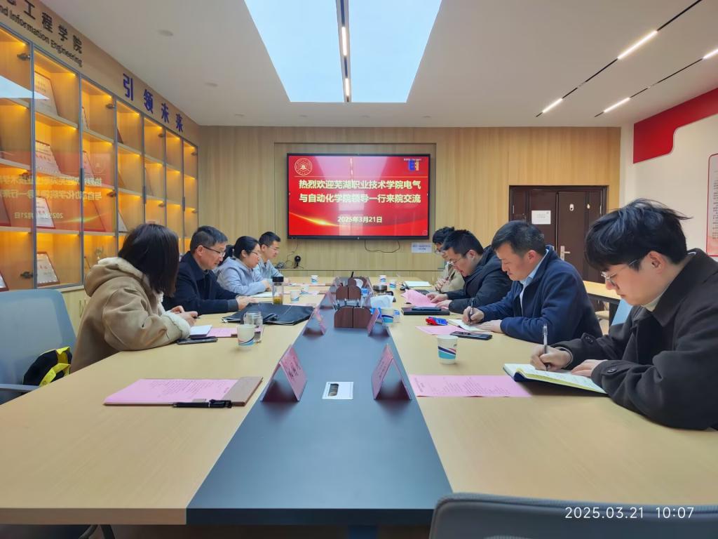 为进一步加强自动化专业的专业联合培养工作,3 月 21 日,芜湖职业技术公司电气与自动化公司副经理邓延安、总支副书记胡俊、自动化教研室主任邵育兰、专任教师胡怡然、辅导员一行来公司进行教学研讨与交流,公司副经理李飞、副处级组织员孔洋波、电气工程系主任王超、自动化系副主任费习宏参会,会议由李飞主持。