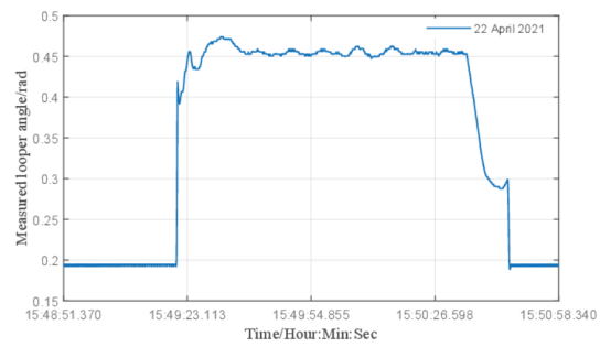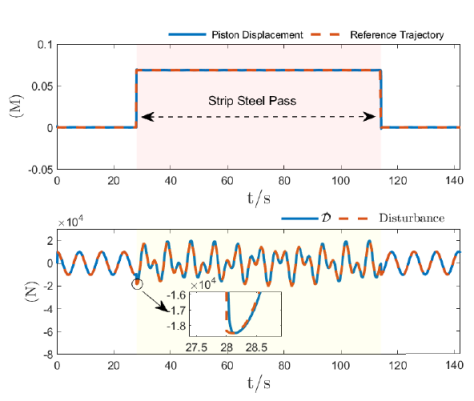在带钢热连轧生产过程中,各机架间带钢的张力稳定是热连轧能够稳定生产的重要生产指标如果张力产生波动,会影响到板带厚度和板形质量,张力的稳定控制成为控的关键。精轧机组前后机架之间安装有活套装置,通过改变活套装置的抬起角度,稳定轧制过程中前后机架之间的带材张力。传统活套装置的张力PID控制方案依赖经验调整参数,对于不同钢种变化复杂的生产条件等实际生产环境适应性差,精细智能化生产对活套装置的控制器设计提出了新的更高要求。研究团队针对热轧活套系统实际运行情况,详细分析了热轧活套装置的角度-张力模型,利用自适应干扰观测器降低了由外部扰动信号所带来的活塞位移波动的负面影响,进一步提高带钢产品质量。