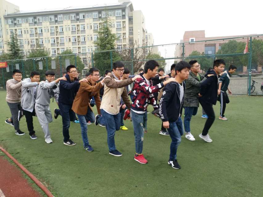 首先开展的是热身游戏“情有千千结”。现场所有同学分组,手牵手围成大圈,主持人在圈外指挥,每个同学都要记住自己的左右两边的人,听到主持人说解散口令后,开始随便在圈内走动,直到主持人说停,大家都停止运动,然后找到刚开始在自己身边的人,保持原地不动,重新牵手,紧接着就是想尽一切办法恢复到原来的牵手状态,否则将被淘汰。参加“链接加速”游戏的人,后边的人左手抬起前边的人的左腿,右手搭在前边的人的右肩形成小火车,最后一名同学也要单脚跳步前进,不能双脚着地。场地上划好起跑线和终点线,游戏开始时,各队从起跑线出发,跳步前进,最先到达起点的为胜。“同舟共济”需要大家齐心协力,力往一处使,才能达到最终的胜利。最后进行了撕名牌的游戏,大家在操场上追逐着,队伍的成员需要相互团结在一起,才能赢得最终的胜利。