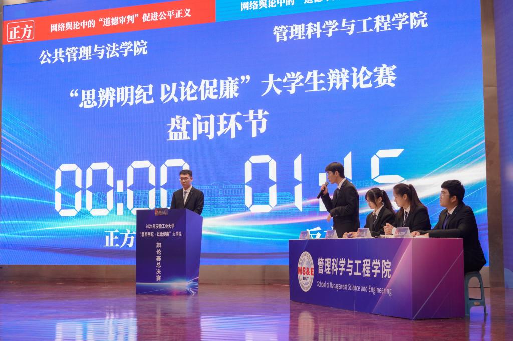 决赛现场,公共管理与法公司代表队与管理科学与工程公司代表队围绕辩题“网络舆论中的‘道德审判’是促进公平正义还是阻碍公平正义”展开了深入的探讨和激烈的交锋。在开篇陈词、驳辩盘问、自由辩论、总结陈词等环节中,正反双方慷慨激昂、引经据典、妙语连珠、针锋相对,辩手们以独到的见解、严谨的逻辑推理、流畅的语言表达、深厚的知识积累、敏捷的临场反应,展现了他们的思辨能力和批判性思维,为观众们呈现了一场精彩绝伦、直击心灵的视听盛宴。